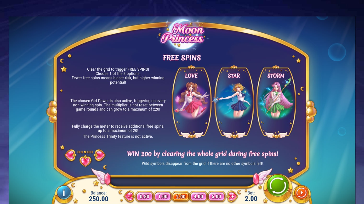 Note that the meter has three sections (one for each moon princess) and you need to fill all three with multipliers to activate the Princess Trinity free spins. And the coolest thing of all is you get to choose which one of the three princesses will assist you during the bonus feature. This is certainly the way to go if you are looking for a one-of-a-kind slot with a decent RTP of around 96%.