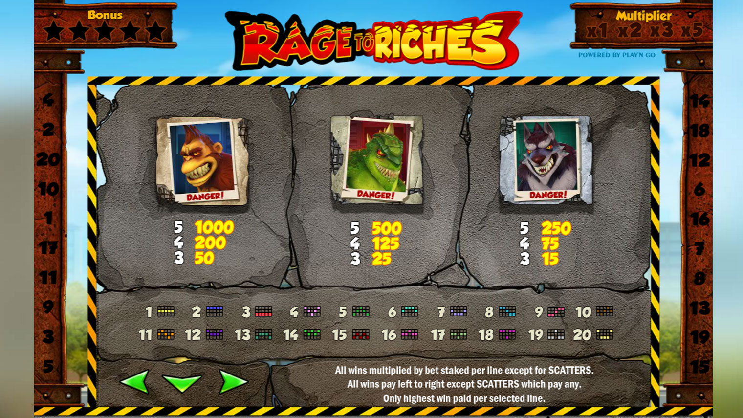 There are wilds and scatters, of course, but the most interesting thing here is the bonus game. To get there, you need to collect 5 bonus stars, which are awarded each time you hit a win with the low-value symbols. Note that you need to score a scatter win aligning Ten, Jack, Queen, King, and Aces from left to right on the reels. The free spins are unlocked by three scatters and you are guaranteed a win once every 3 bonus rounds. The RTP of Rage to Riches stands at 97.12%.